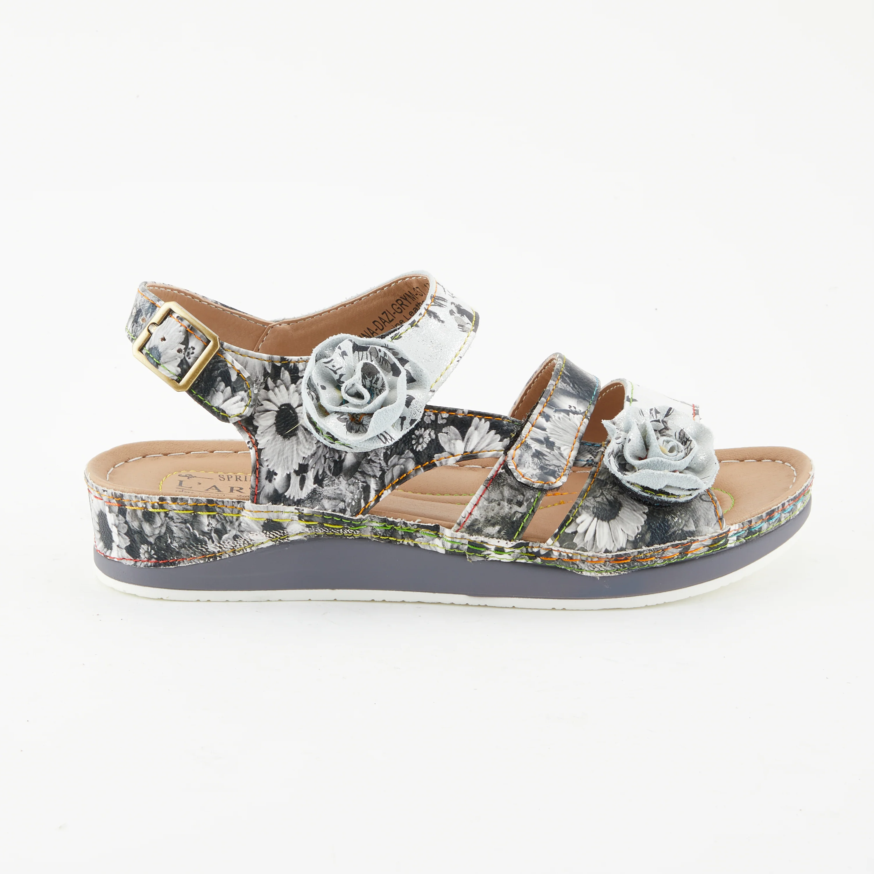 This beautiful French inspired design belongs in a museum. It's hand painted leather featuring a unique floral pattern, two rose buds and our signature rainbow stitching. It also has 3 points of adjustability: two Hook and Loop Velcro closures at the top of the foot and one buckle at the heel. This is one of our most loved constructions.
